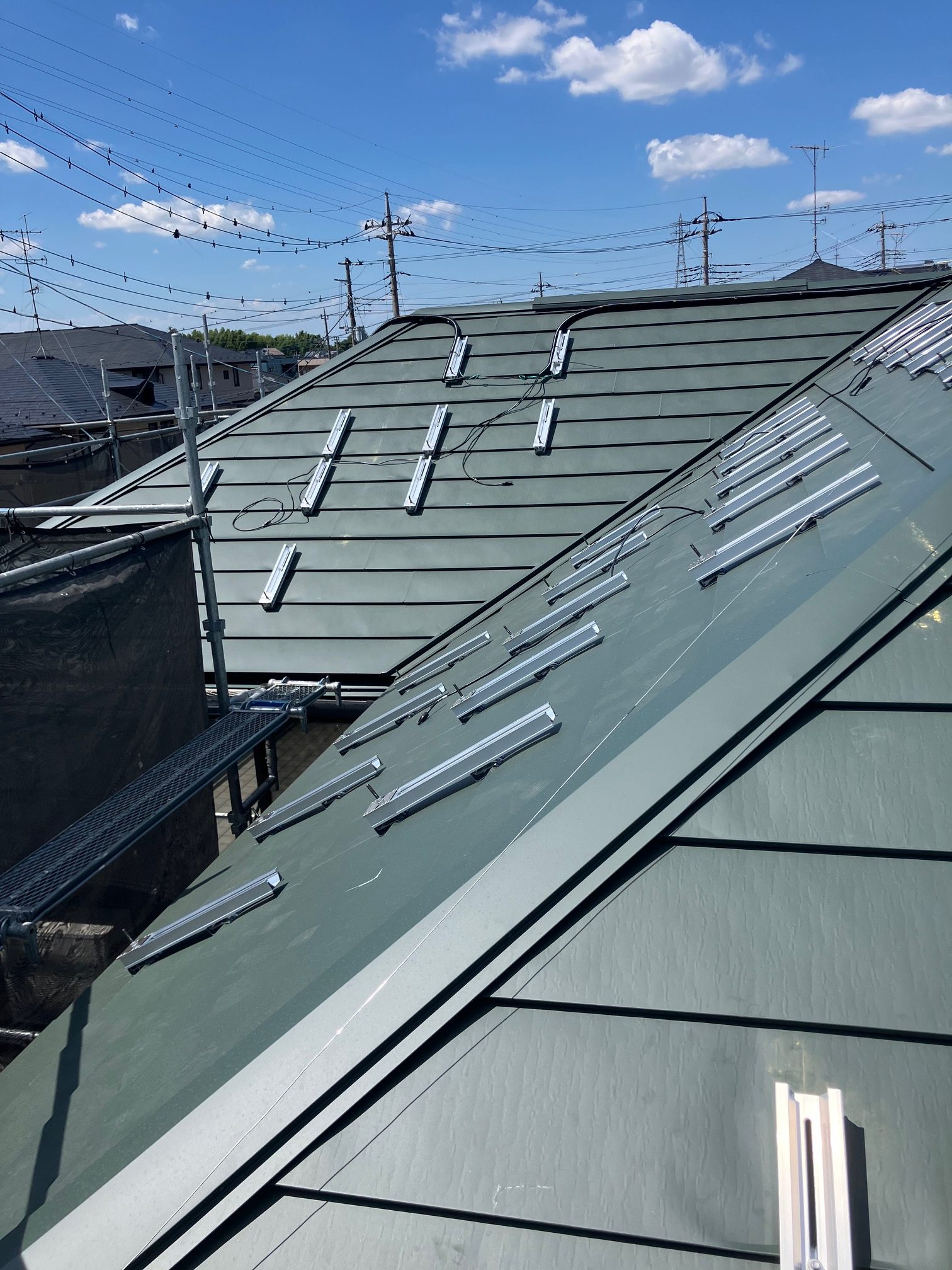 ガルバリウム横吹き屋根を葺き上げてから太陽光の架台を設置します